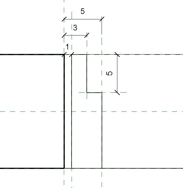 Mediante l'avvio di una nuova sessione dell'editor di famiglie, si apre profilo_metrico.rft per generare una sezione delle cornici esterne. Dopo aver fissato dei piani di riferimento secondo i vincoli in figura, si disegnano i segmenti di perimetro del profilo, con smussi di 0.5 cm. per la modanatura più esterna. La famiglia viene salvata come file di famiglia caricabile.